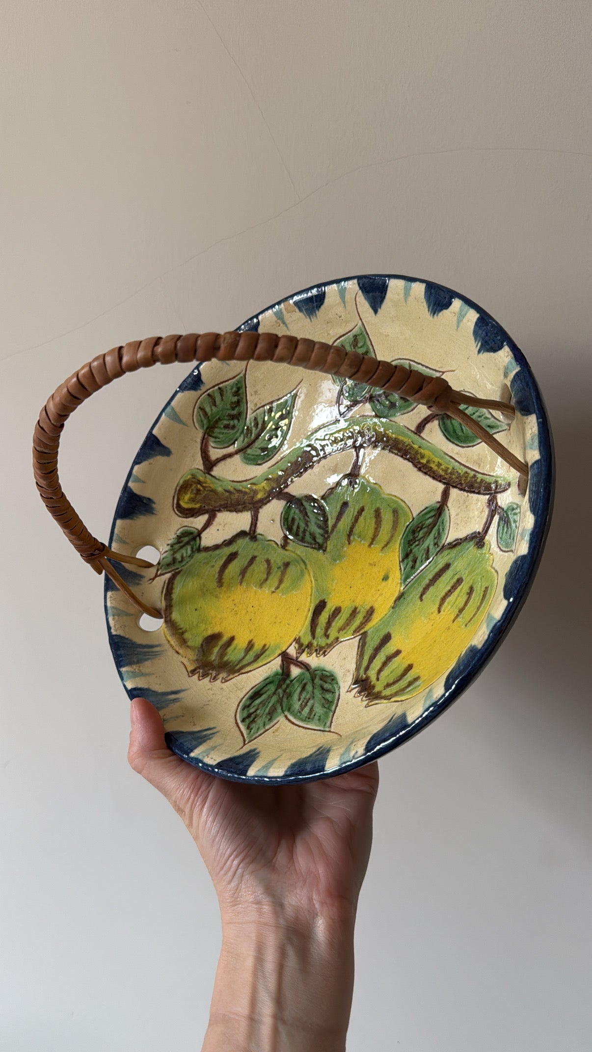 Vintage 1960’s Spanish fruit bowl with rattan handle. Beautifully hand painted.